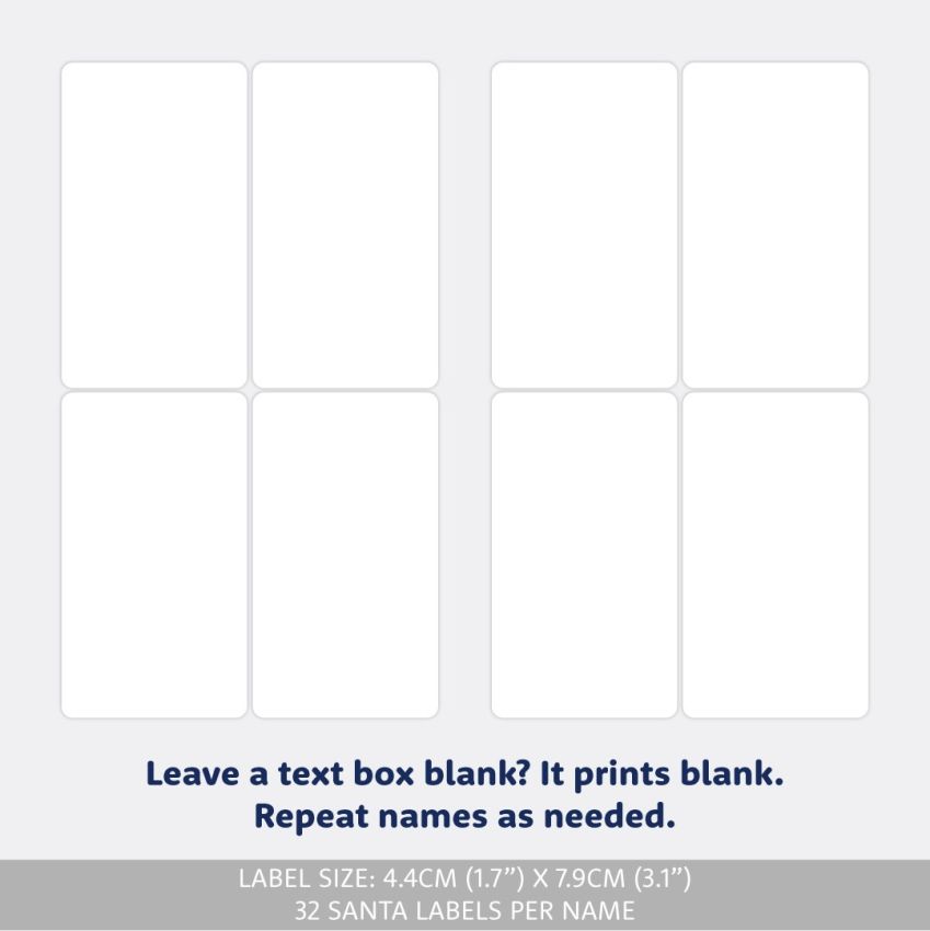 How many names can I add?The Family Santa Labels Value Pack includes up to 4 different names in one set (32 labels per name). If you only need labels for one child, check out our classic Santa Gift Labels instead. They’re perfect for single-name packs.