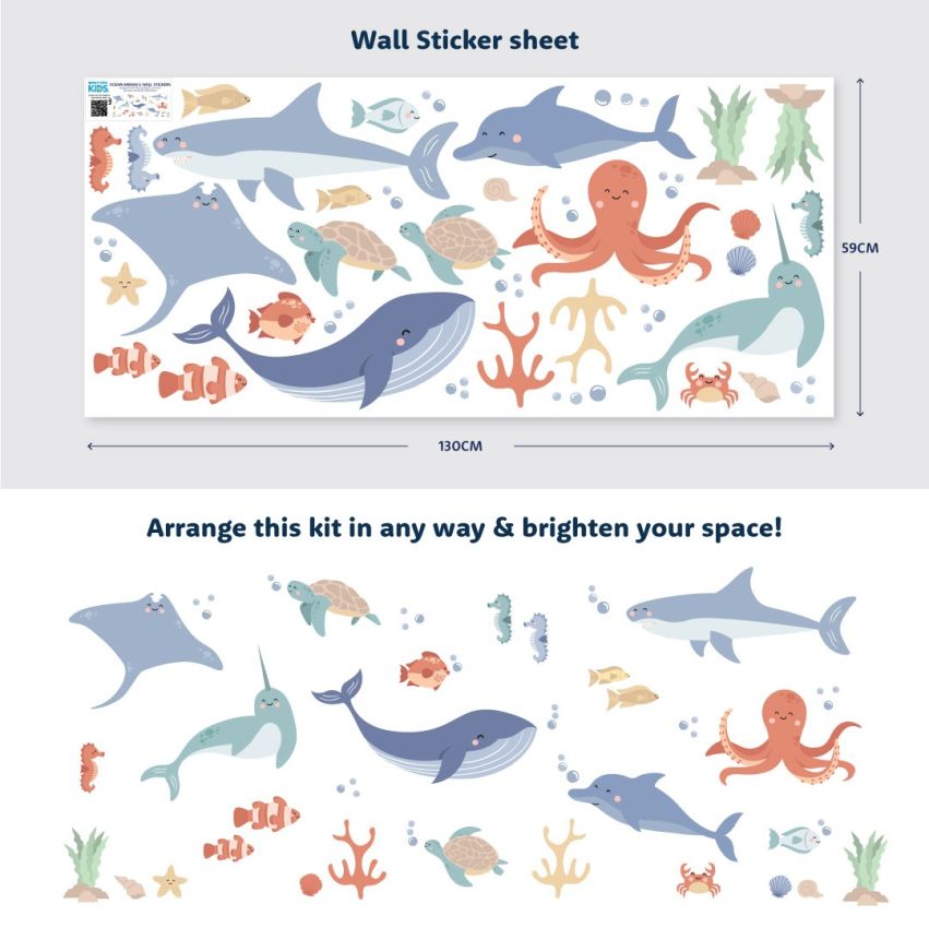 What do I get in the pack?You’ll receive one rolled sheet (130cm x 59cm) of pre-cut sea animal wall art stickers, including smiling whales, cheeky crabs, gentle sea turtles and more.